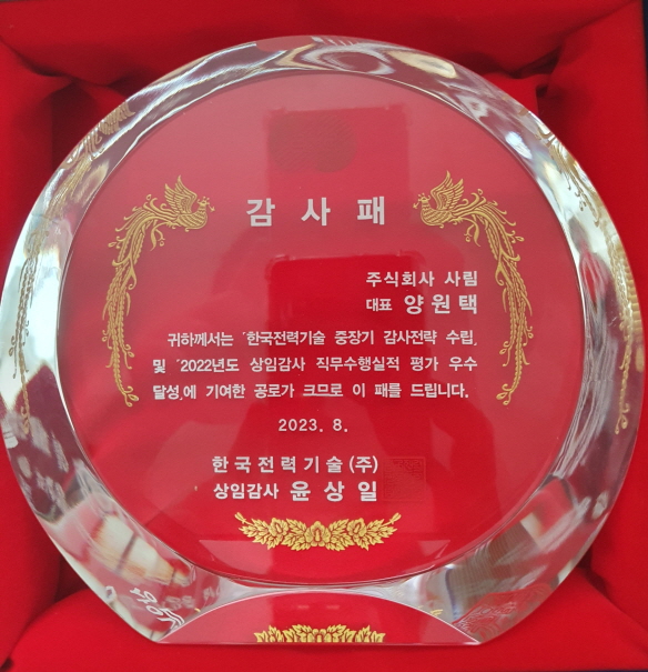 주식회사 사림(공동대표 양원택)은 2023년 8월 22일, 한국전력기술로부터 「중장기 감사전략 수립」 및 「2022년도 상임감사 직무수행 실적평가 우수 달성」에 따른 감사패를 수여받았다.